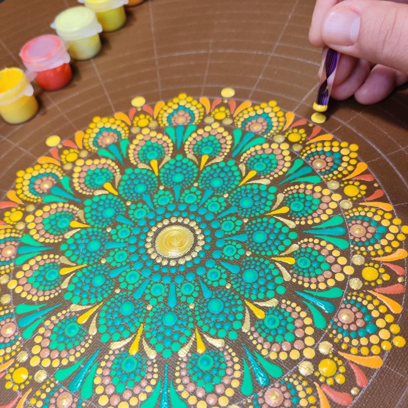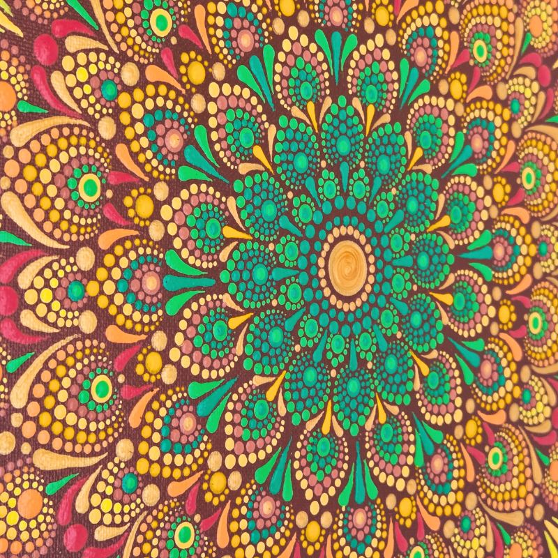Le choix des pigments s’est porté sur des ocres profonds, des ors irisés et des terres d’ombre. La finesse des points crée un mouvement circulaire, une danse qui part du centre vers l’infini. Chaque relief de peinture est une ancre pour l’intention d’acceptation et de lâcher-prise.