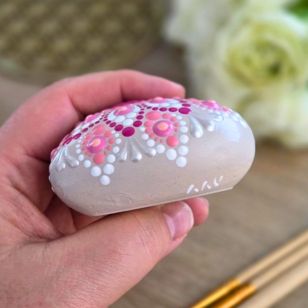 Le geste est ici précis, partant d’un centre fuchsia profond pour s’ouvrir vers des nuances plus tendres et lumineuses. Chaque point est une pulsation, un battement de cœur rendu visible. Le fuchsia symbolise ici la puissance du chakra du cœur lorsqu’il ose s’exprimer pleinement, tandis que les reflets dorés et blancs apportent la touche de sacré et de pureté nécessaire à l’équilibre. C’est un dialogue entre force et délicatesse.