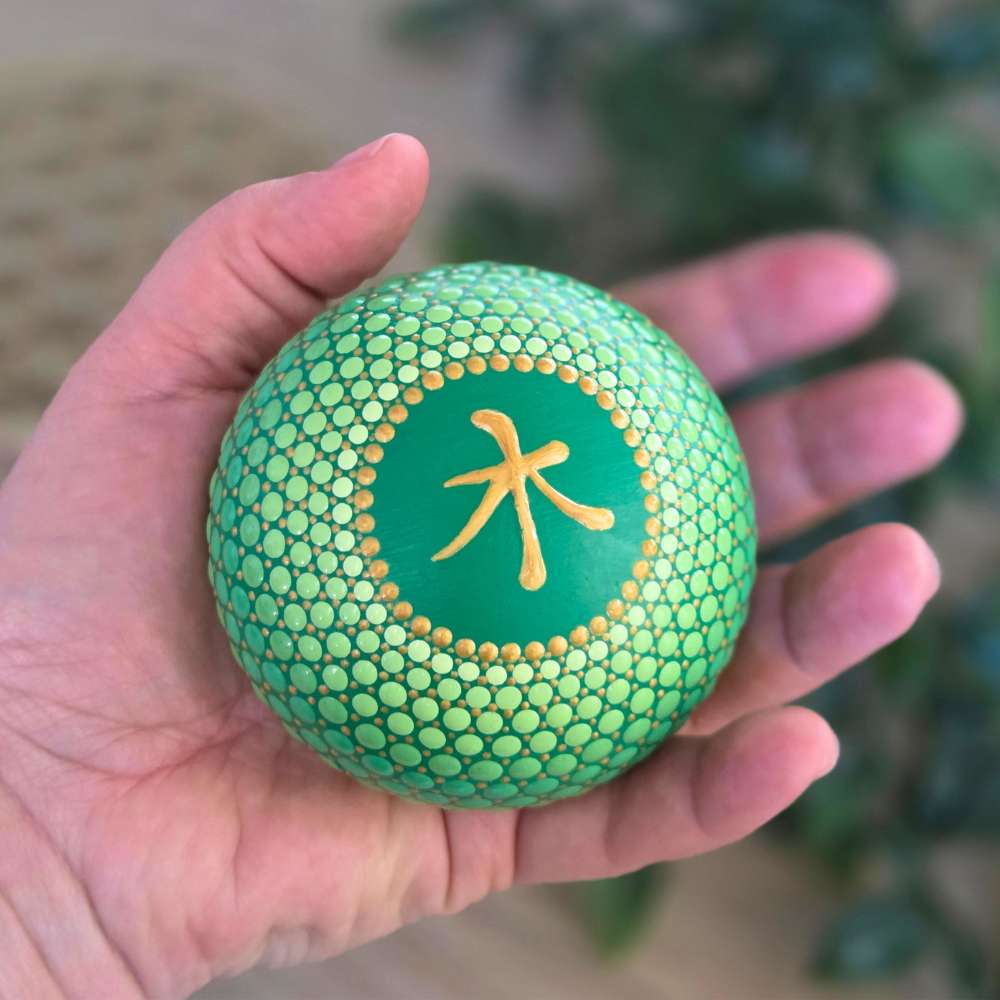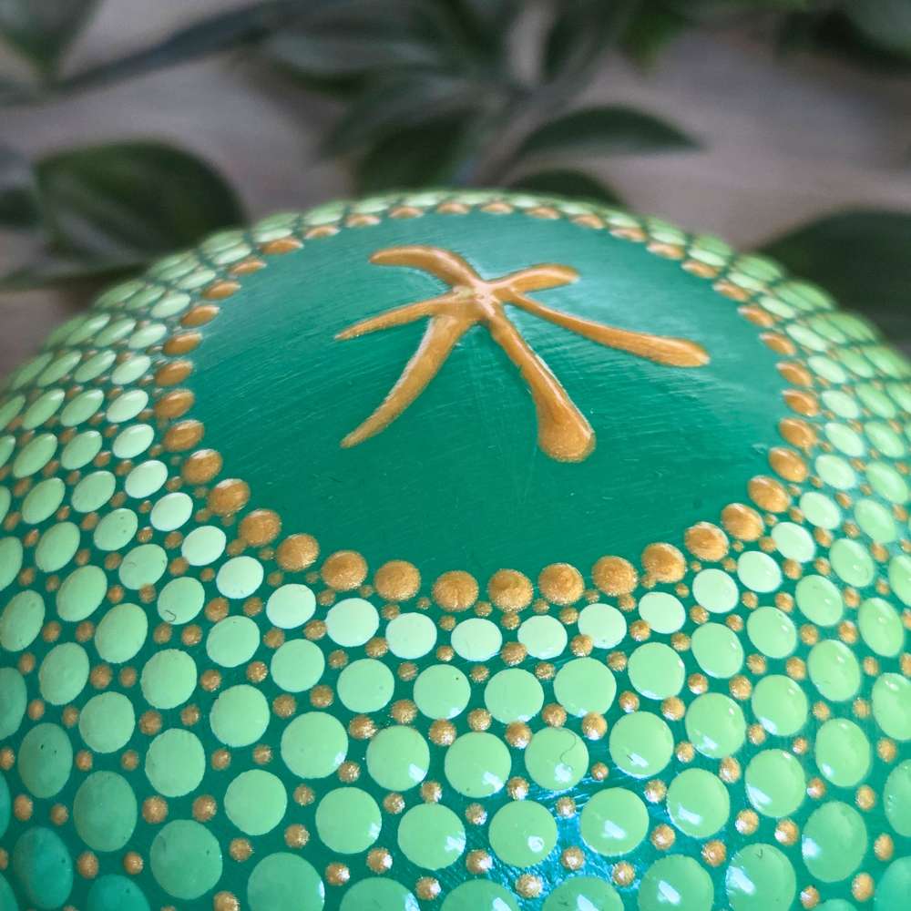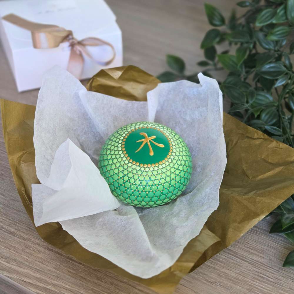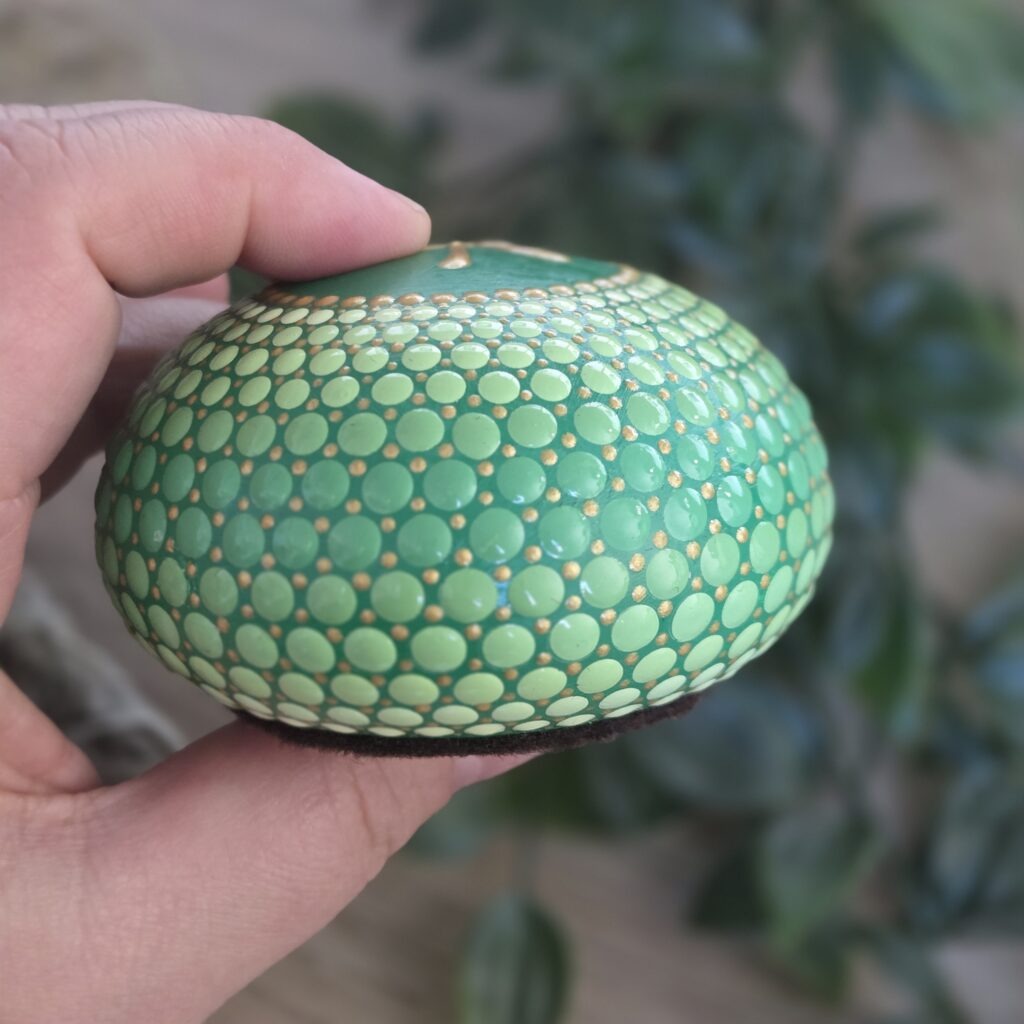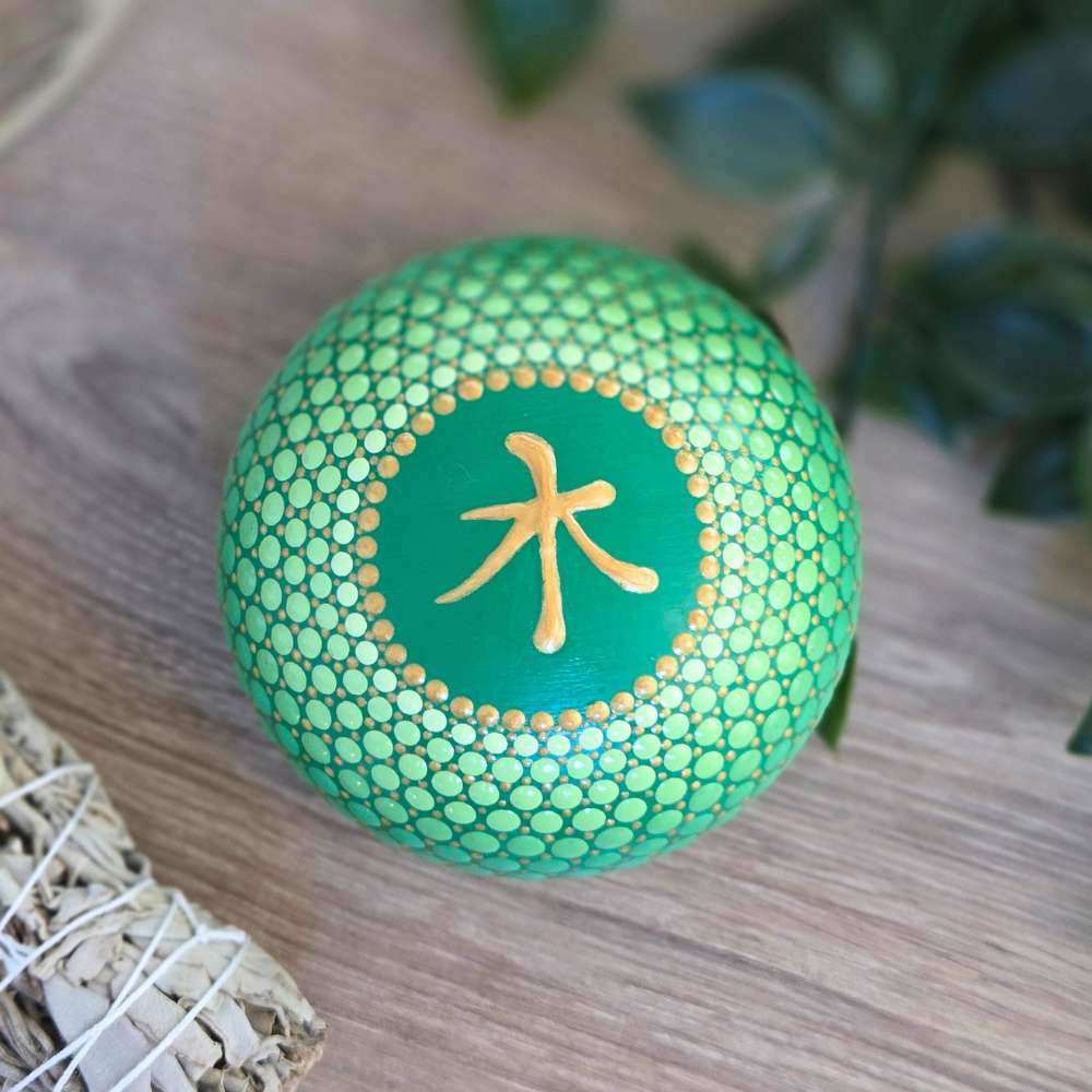 Ce design est une création originale exclusive, née de mon cheminement entre art vibratoire et géométrie sacrée. Conçu selon les principes du Feng Shui, ce dôme offre une prise en main apaisante et solide. En effleurant les reliefs des points, vous entrez en contact avec la texture de la croissance. J’ai choisi ces nuances de verts émeraude et de reflets dorés pour évoquer la canopée baignée de lumière.