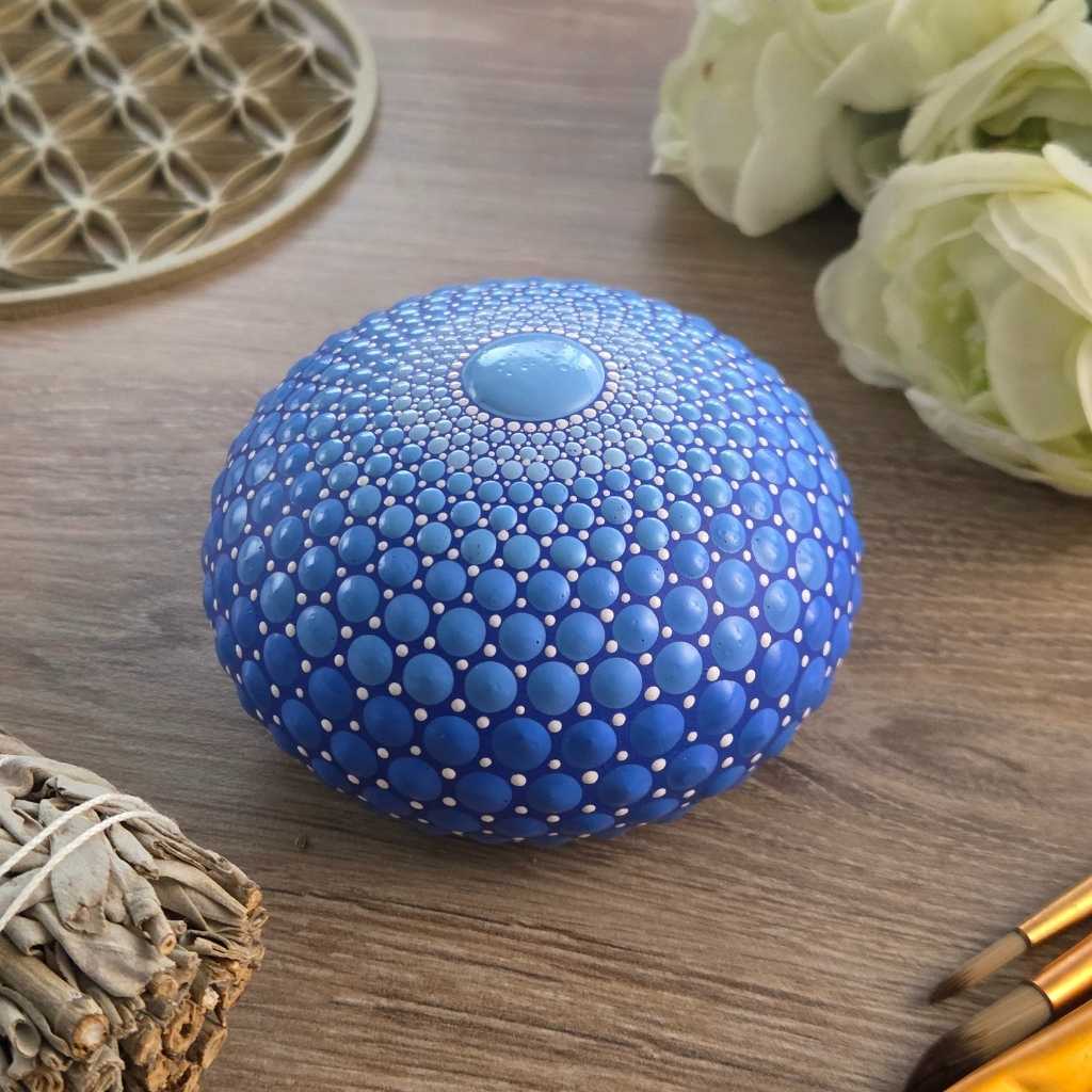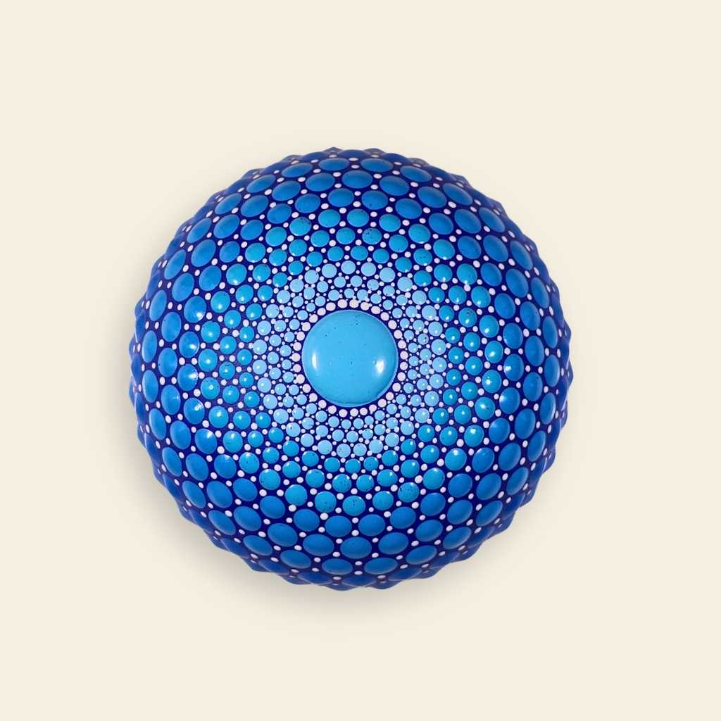 Chaque point de cette œuvre est déposé en état de conscience, respectant la progression sacrée de la Suite de Fibonacci. Cette géométrie, omniprésente dans le vivant, apporte un ordre harmonieux et hypnotique. La palette de bleus et de blancs immaculés symbolise la fluidité et la communication spirituelle. Le contraste des points, tantôt denses, tantôt aériens, crée un relief vibrant qui capte la lumière et donne vie au mandala au gré de vos déplacements.