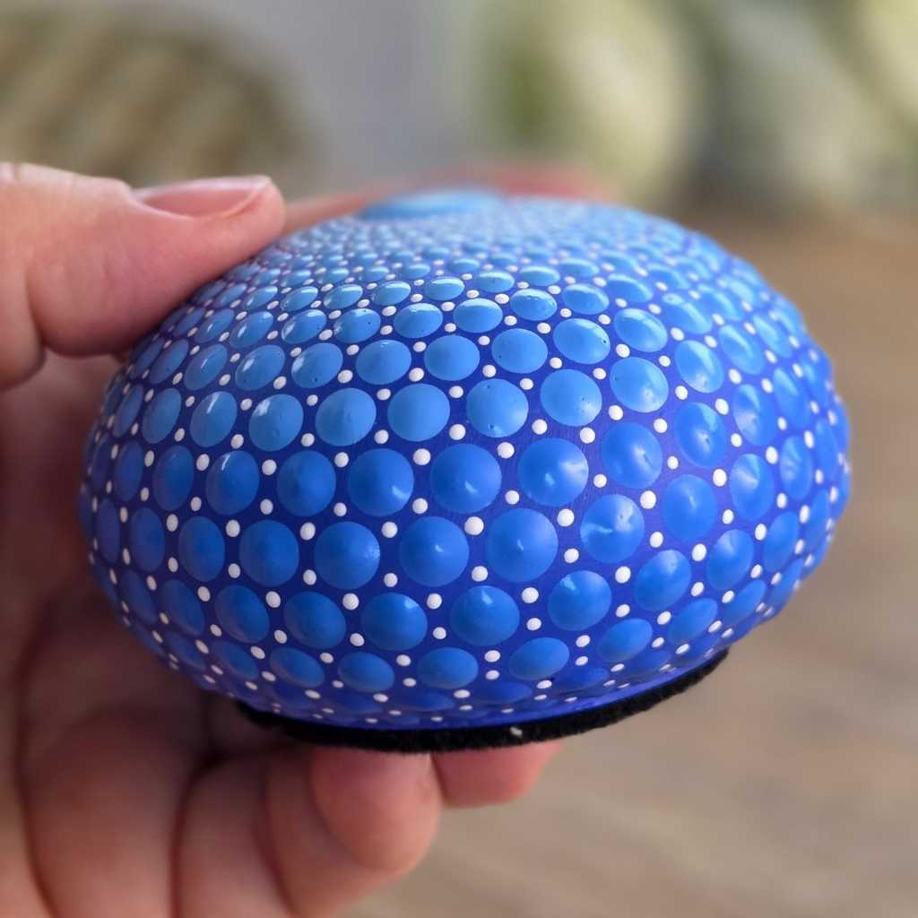 Né d’un Élan Intuitif, ce galet n’a pas été dicté par une volonté mentale, mais par une réception pure. J’ai laissé ma main traduire cette sensation de pureté que l’on ressent en contemplant un ciel sans nuages. Le support dôme, que je confectionne avec soin, offre une rondeur généreuse qui épouse parfaitement la paume. Tenir Souffle d’Azur, c’est entrer en contact avec une douceur physique qui prolonge l’expérience visuelle, créant un lien charnel entre l’œuvre et vous.