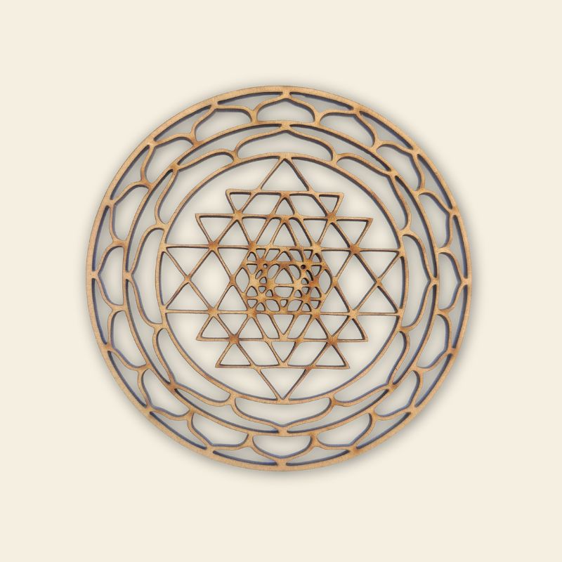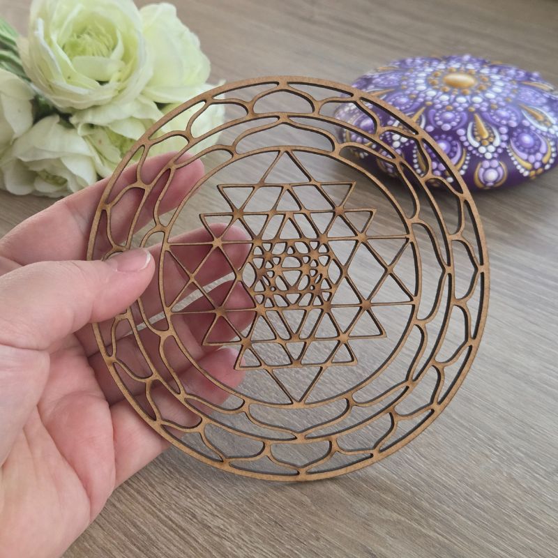 Un plateau de dynamisation énergétique : Le Sri Yantra est considéré comme l’un des symboles les plus puissants pour attirer l’abondance. En l’utilisant comme support, vous offrez à vos créations une fréquence d’épanouissement. J’aime l’idée que ce sceau agisse comme un aimant à énergies positives dans votre foyer.